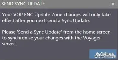 注意每一次因为换航线需要而更改选择更新的海图或者按照VOP 区域进行选择性更新,都会有下图一样的提示,(左图为设置根据航线更新的后提示,右图为设置VOP 区域选择性更新后的提示)如果改完设置直接自己联网更新则不必理会提示,如果需要供应商邮件回复更新内容,则发送文件到指定邮箱即可,方法在 HOME栏点击SEND A SYNCUPDATE