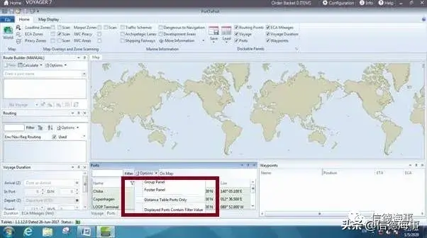 VOYAGER7还有自动规划航线的功能HOME界面右下角点RUNATOBVIAC进入主页点DISTANCETABLE PORTONLY,然后输入你的起始港和目的港口,在点 CALCULATE后会自动规划航线,接着点击左上角的小图标会自动同步 VOYAGER界面进行海图的选购,注意此航线只是建议.仍需要你进行在电子海土进行核对修改.