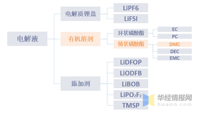 电解液是锂电池四大关键材料之一,其主要成分为有机溶剂、电解质锂盐和添加剂。锂盐是电解液的关键部分,锂盐的选择对电池的容量、能量密度、功率密度、工作温度、循环性能及安全性能均有较大影响。溶剂占到电解液成本的30%左右,以使用碳酸酯类溶剂为主,包括碳酸二甲酯(DMC)、碳酸二乙酯、碳酸甲乙酯、碳酸乙烯酯和碳酸丙烯酯等,目前常用的电解液溶剂为5种碳酸酯溶剂混合体系,其中DMC渗透率最高。