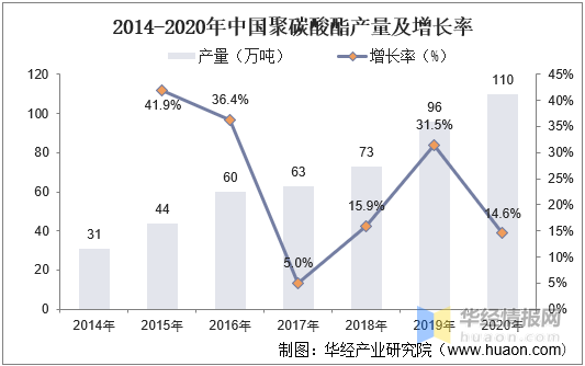 DMC下游需求中聚碳酸酯应用比例最高达到30%,电解液溶液占比28%,其次是出口(17%)、显影剂(8%)胶黏剂(7%)和涂料(5%)等。就我国聚碳酸酯现状而言,我国聚碳酸酯产量逐年升高,目前国内企业需求空间主要来源于进口替代,但相对于全球五大主要生产企业而言,国内的企业无论是在生产规模,产品成本,产品质量都存在较为显著的差距。数据显示,我国聚碳酸酯产量为110万吨,同比2019年增长14.6%。近两年非光气法聚碳酸酯大量投产,DMC替代光气作为羰基化试剂,需求有望进一步大幅增长。