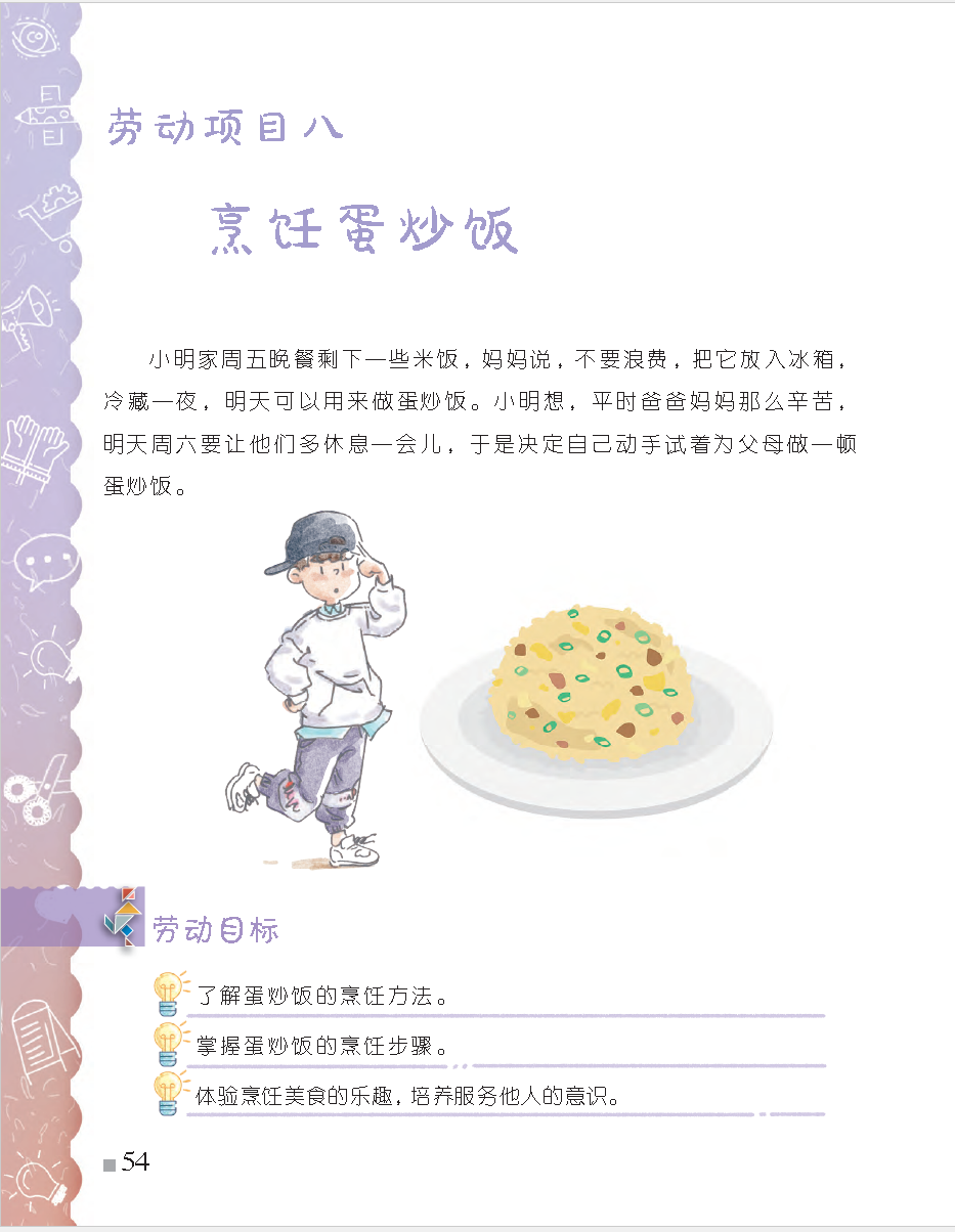 第二学段(3~4年级) ,学会做凉拌菜、拼盘,学会蒸、煮的方法,如加热馒头、包子,煮鸡蛋、水饺等;