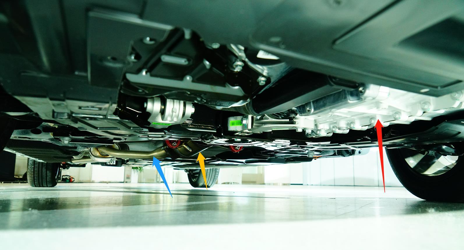 需要注意的是,帝豪L雷神Hi·X混动版的前悬架(没有配置下护板)、动力电池以及后悬架(没有配置下护板)处于一个水平线。即便前置的混动专用四缸机的排气管(头段),仍然被很好地“隐藏”起来,没有“耷拉”出一截。