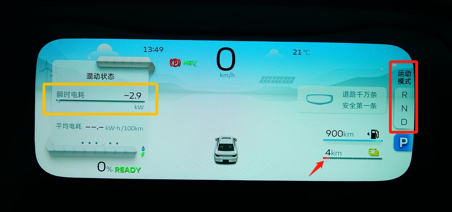 在笔者测试过程中发现,但车辆动力电池SOC值处于较低位置时,启动运动模式强制启动发动机后,在P挡模式下,车辆开始进入原地发电模式,此时发电功率为2.9千瓦。