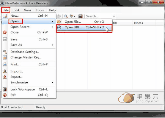 或者打开选择 URL 的方式,使用 WebDAV 连接到坚果云,不用下载密码库文件到本地,直接打开之前存放在坚果云云端里的密码库文件,URL 地址:坚果云服务器地址,账号:坚果云注册账号,密码:坚果云第三方应用密码(注意:非登录密码)。