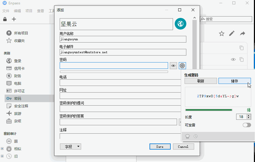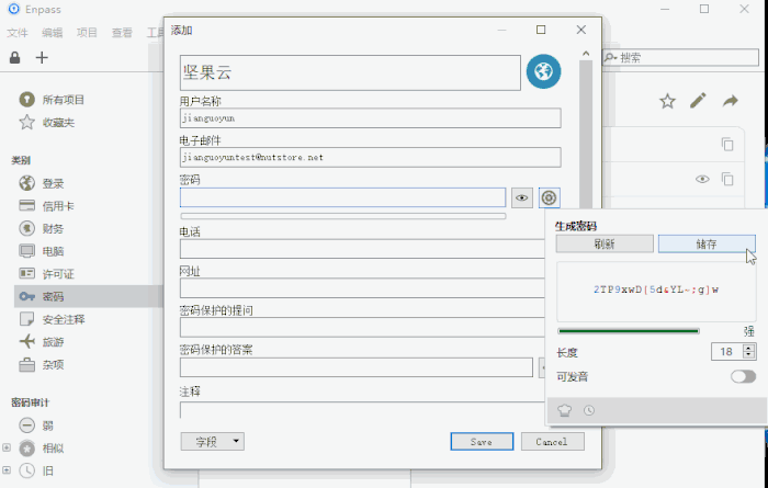 以下是 Enpass 电脑客户端界面,针对不同的使用场景,设置了例如登录、信用卡、财务等类别,可以分别进行填写。在设置密码时可以选择自己手动添加或者系统自动生成自己想要的位数的复杂密码。另外,可以设置无操作几分钟后自动上锁,防止离开后他人打开查看。
