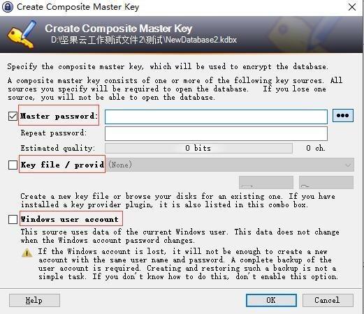 选择数据库保护方式,包括以下三种类型:主密码,密钥文件,Windows 用户帐户,三种方式可以叠加使用,所以 KeePass 的安全性还是非常高的。