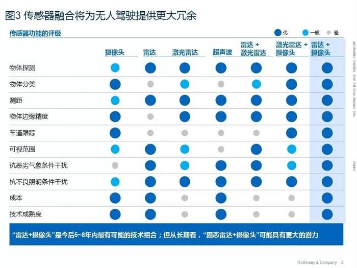 在今后两到三代汽车产品上,整车企业将安装多个具备相似功能的传感器,来确保车辆具有充足的安全冗余。长期看来,行业将开发更完善的传感器解决方案来减少传感器数量和成本。