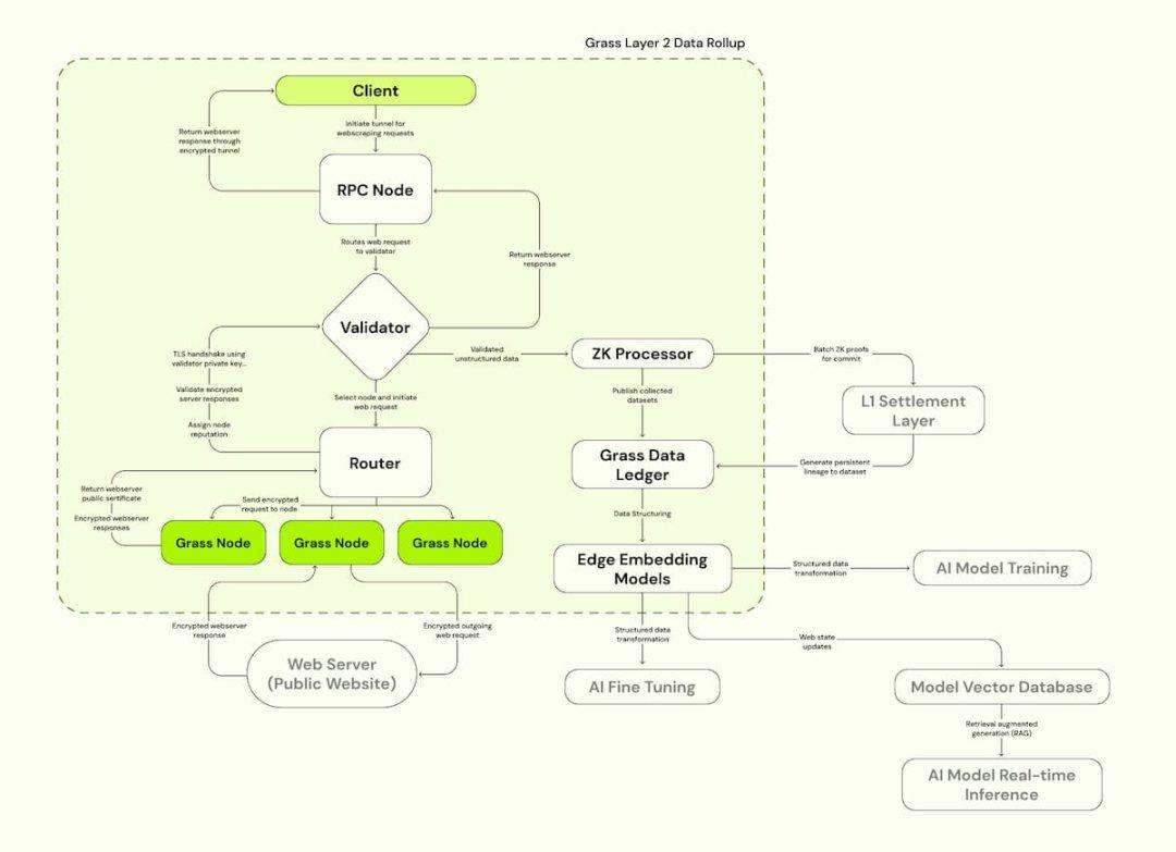 Grass 于 2023 年 6 月推出,专注于将公共网络数据转化为人工智能数据集,让开源人工智能项目更容易访问公共网络数据。Grass 的解决方案是构建 L2 数据 Rollup,这将使得引入一种记录元数据的机制成为可能,该元数据记录了所有数据集的起源。