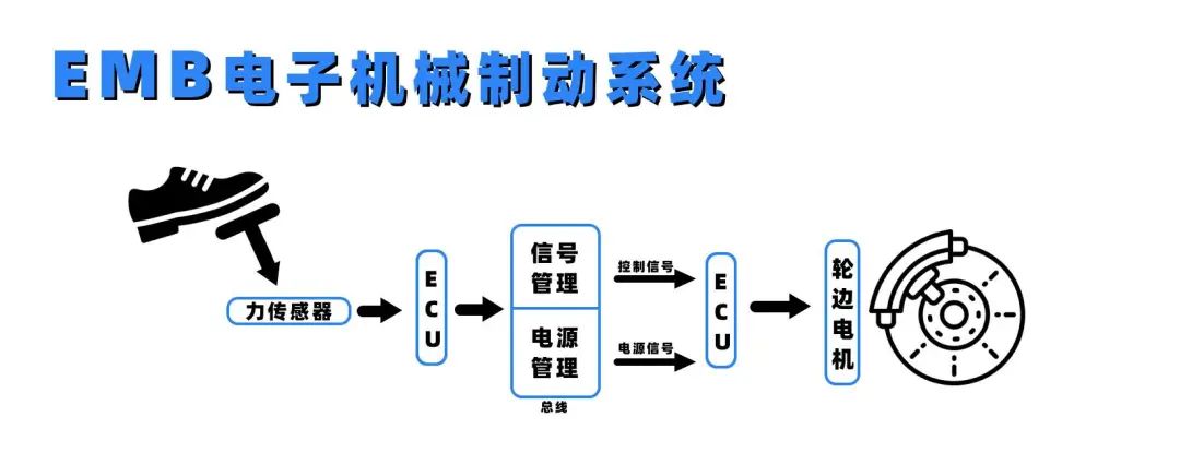 EMB方案的原理非常简单,踏板与力传感器连接,获取刹车信号后,直接驱动车轮边上的电机进行刹车,中间没有任何物理连接,全靠电信号传输。