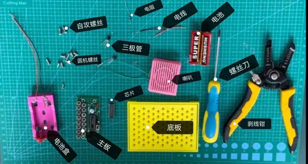 电池盒、主板、芯片、底板、喇叭、电线、电阻、三极管、圆机螺丝、自攻螺丝、电池