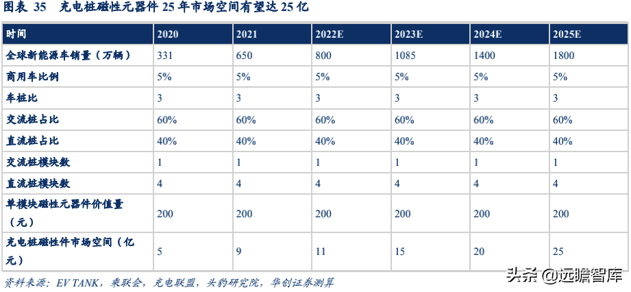 预计充电桩磁性元器件市场空间 25 年达 25 亿。 根据充电联盟数据 2018~2019 年国内充电桩保有量交流、直流桩比例为 6:4,假设全球充电桩交直流保持这个比例;2019 年新增直流充电桩平均功率为 116KW,未来随着高压快充方案不断推进装机功率有望持续提高;假设 2021 年以后商用车占新能源车比例为 5%,商用车采用换电模式,不配套建设充电桩;根据产业链调研显示目前充电桩每 20~30kw 为 1 模块,每个模块磁性元器件价值量200 元,假设交流电每桩采用 1 个模块,直流桩每个采用 4 个模块。根据我们计算结果21 年充电桩磁性元器件市场空间 9 亿元,25 年充电桩磁性件市场空间有望达 25 亿,4 年CAGR 29.1%。车载&充电桩磁性件 21 年合计市场空间 35 亿元,25 年合计 97 亿元,4年 CAGR 29%。