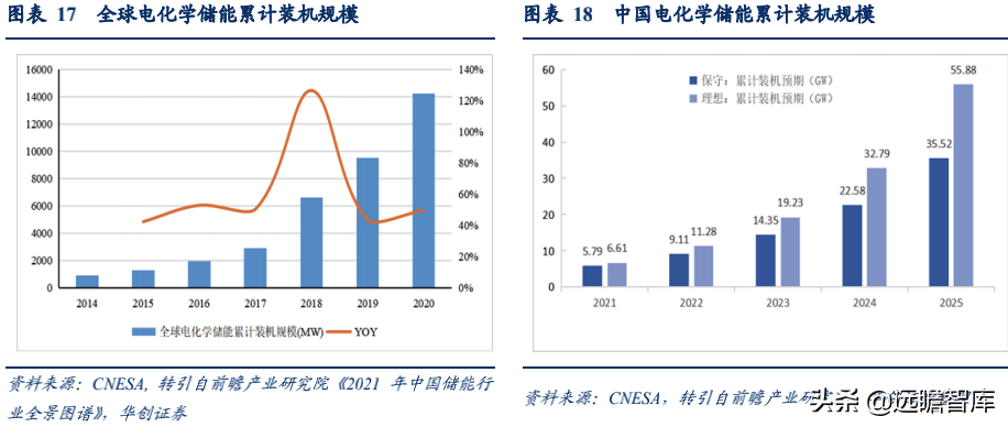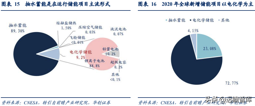 电化学储能为新增储能主流方案。 过去国内外储能项目以抽水蓄能为主,截至 2020 年抽水蓄能在全球储能的装机占比高达 89.3%,其次则是电化学储能,占比达 9.2%。而在 2020年新增储能装机中,电化学储能装机占比却高达近 73%,是目前主流的储能装机技术方案。