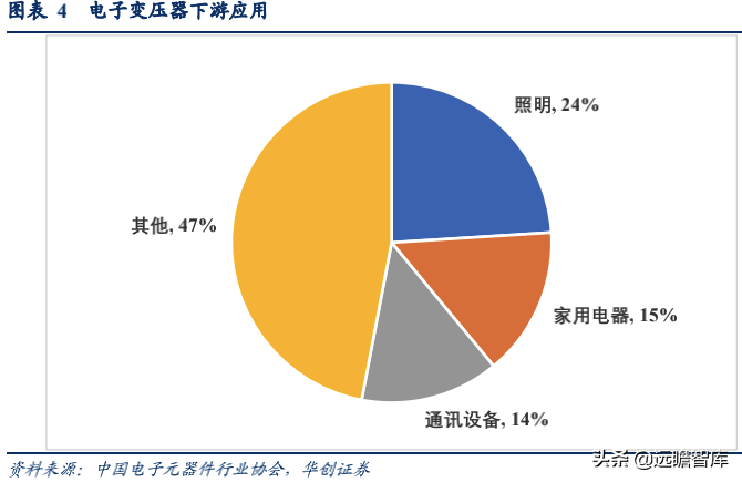 照明、家电为基,新能源、工控医疗、可穿戴驱动电子变压器发展 。照明、家电是电子变压器基础应用市场,占全球变压器规模比例分别为 24%、15%。此外,通讯设备、移动终端、计算机设备、工业、医疗设备、光伏等新能源均为电子变压器重要下游应用。未来几年下游光伏储能、新能源汽车及充电桩、工控医疗、通讯、可穿戴等快速发展,将成为拉动电子变压器市场增长的主要动力。