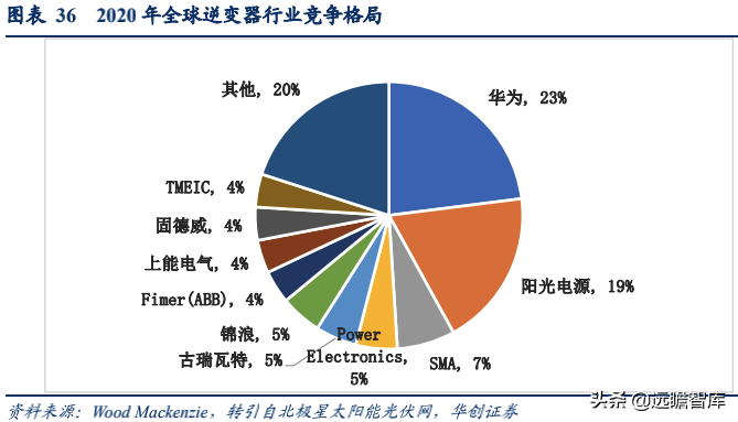 下游逆变器行业集中度高,国内厂家居前 。全球光伏产业链各个环节的主要生产地均在中国。国内逆变器厂家凭借成本、完善的产业链布局、快速发展的市场等优势全球市场份额不断提升,其中华为、阳光电源自 2015 年起稳居市场前二,国内其他厂家如锦浪科技、固德威也迎来快速发展。根据 Wood Mackenzie 数据 2020 行业 CR10 近 80%,前两名玩家华为、阳光电源分别占据 23%、19%份额,CR2 42%,加上其他国内厂家前十名里国内厂家份额高达 60%。