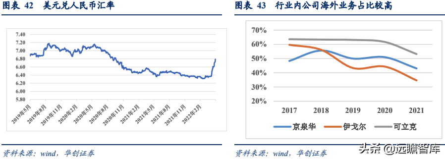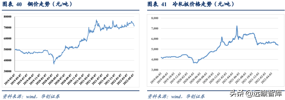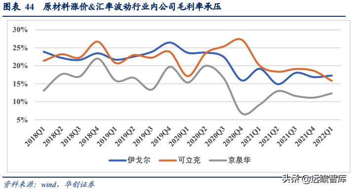 人民币贬值、大宗企稳回落迎拐点 。受制于原材料涨价和汇率波动,行业内公司盈利水平承压,2020Q3 起国内代表企业毛利率下滑。22 年 4 月下旬美元兑人民币汇率从 6.36快速上行,目前汇率在 6.66 区间,全年维度看随着大宗商品价格企稳回落、汇率逐渐修复,行业内公司盈利水平有望逐渐修复,拐点出现。