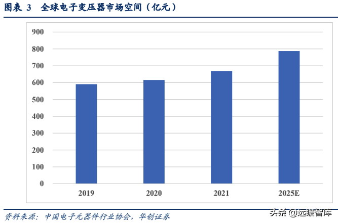 全球电子变压器市场稳健增长。 电子变压器是利用电磁感应来实现交流电压升降或阻抗变换功能的电子元件,由铁芯(或磁芯)和线圈组成。2020 年全球电子变压器市场规模约为 615.8 亿元,同比增长 4.3%。2021 年以来由于中国市场的强势增长,中国电子元器件行业协会预计 2021 年全球电子变压器市场规模将达到 668.4 亿元,同比增长 8.5%,至2025 年将达 786.8 亿元,2020-2025 年五年平均增长率约为 5.0%。