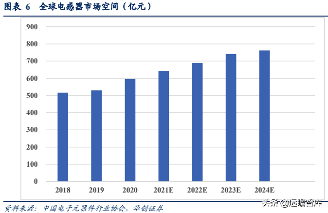 电感器是指可以将电能以磁性的形式存储的被动电子元件,是电子电路中的基础无源元件之一,全球需求量达 3 千多亿只,电感器包括传统插装式电感器及片式电感器。根据中国电子元器件行业协会数据,2020 年全球电感器市场空间约 597 亿元,随着通讯技术的快速更迭以及物联网、智慧城市等不断发展,到 2024 年市场空间将增至 761.5 亿元,2019~2024 复合增长率为 7.5%。