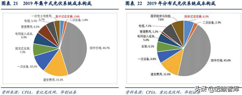 组串式逆变器量增价高。 与集中式逆变器相比,组串式逆变器占光伏系统成本 6.3%,价值量更高(集中式逆变器占光伏系统成本 2.6%)。