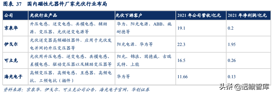 作为逆变器上游的磁性元器件国内厂家同样处于领先地位,头部企业有京泉华、海光电子、可立克、伊戈尔。各磁性元器件厂家客户和产品各有侧重,收入规模皆超 10 亿元。
