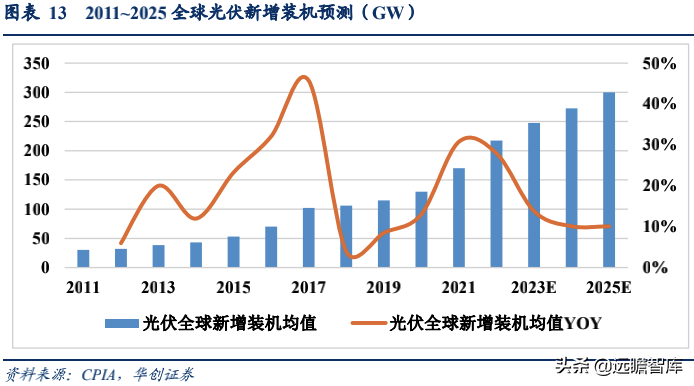 图表 14 2011~2025 中国光伏新增装机预测(GW)