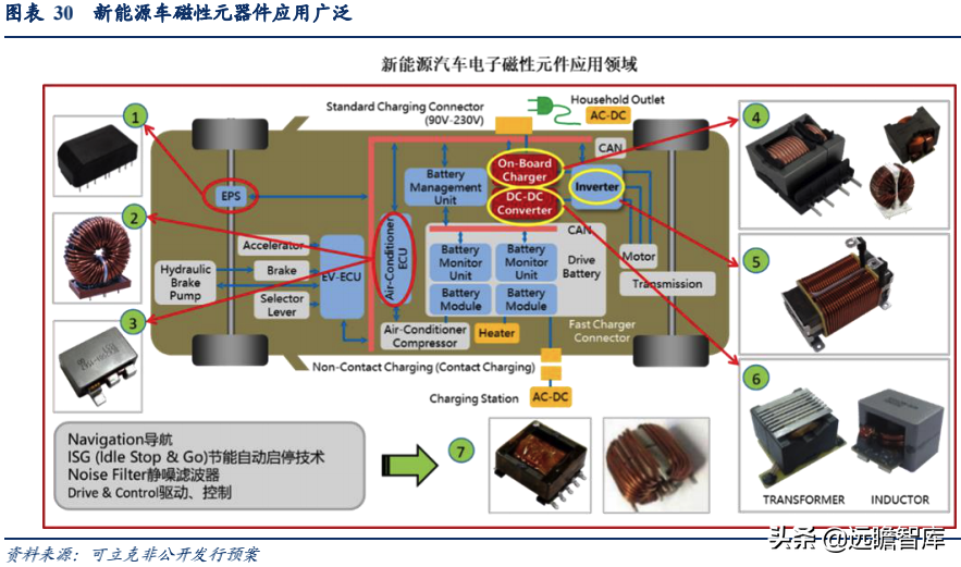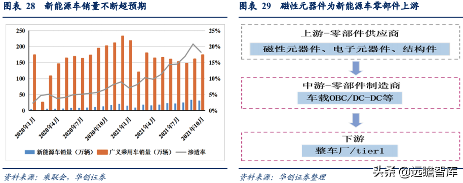 (一)车载&充电桩磁性元器件应用广泛,800V 架构下车载磁性元器件国产替代加速新能源车销量不断超预期,车载磁性元器件应用广泛。 2021 年初乘联会预测 2021 全年国内新能源车销量 200 万辆,2025 年销量 600 万辆,5 年 CAGR 34.4%,而 2021 年 1~10月国内新能源车实际销量就达 213.8 万辆,超过全年预期。磁性元器件为新能源车 OBC、DC/DC 等零部件上游,磁性元器件在车载应用包括车载充电机 OBC 电感/变压器、低压直流转换器电感/变压器(low DC/DC)、高压直流转换器电感(high DC/DC)、滤波器等。