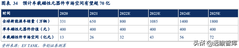 预计车载磁性元器件市场空间 25 年超 70 亿。 根据 EV TANK 数据,2025 年全球新能源车销量 1800 万辆,十年 CAGR 40.3%;根据产业链调研显示纯电动车单车磁性元器件价值量在 300~500,取单车价值量 400 计算。根据我们计算结果 21 年车载磁性元器件市场空间 26 亿元,25 年车载磁性件市场空间有望超 70 亿,4 年 CAGR 28.1%。