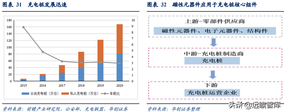 政策+下游需求双重刺激充电桩有望加速,磁性元器件应用于充电桩核心组件。 过去几年中国充电桩保有量快速增长,车桩比不断降低,然而截止 2020 年车桩比仍有 2.9,离《电动汽车充电基础设施发展指南(2015-2020 年)》1.04 的目标仍有较大差距,在政策+下游需求双重刺激下充电桩有望加速发展。充电桩主要分为充电模块、主控板、充电枪/线束、壳体,其中充电模块是核心部件之一,具有交直流转换等功能,磁性元器件主要运用于充电模块。