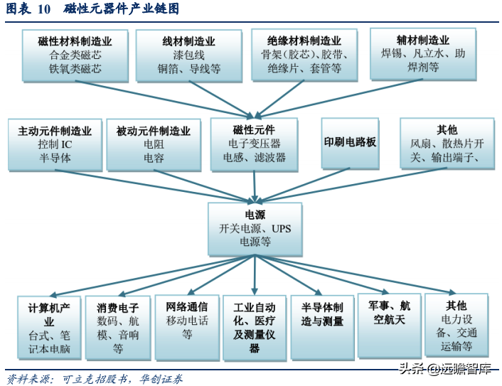 磁性元件为产业中游 。上游包括线材制造业、磁材制造业、绝缘材料制造业及辅材制造业,下游为各行业应用的各种电源类产品(含逆变器)。