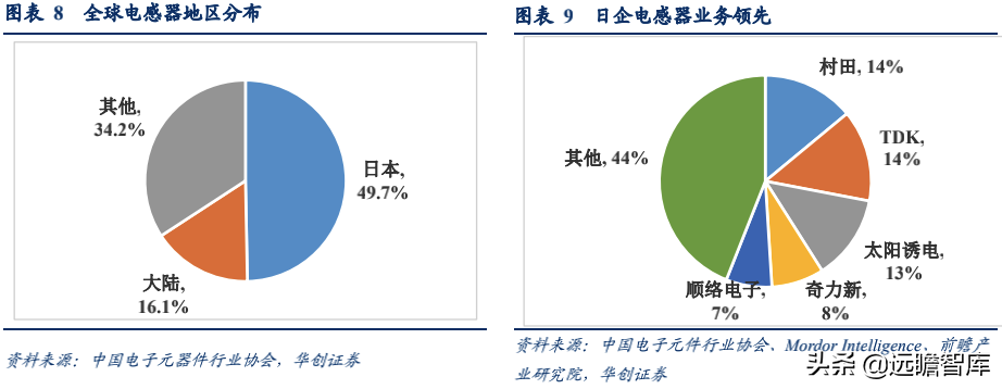 日系主导,电感器国产替代空间广阔。 全球电感器主要制造商集中在日本、美国、中国大陆、中国台湾、韩国、德国等地,骨干企业包括村田制作所、TDK、太阳诱电、胜美达、Vishay、线艺电子、顺络电子、奇力新、三星电机、伍尔特等。其中,日本企业的整体市场占有率最高,达到 49.7%;中国大陆电感器制造商约占全球 16.1%的份额。