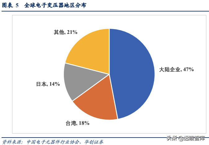 全球电子变压器制造商主要集中在中国大陆、中国台湾及日本,骨干企业包括台达、光宝、TDK、胜美达、海光、京泉华、可立克等。其中,中国大陆企业约占全球 47%的市场份额、中国台湾企业约占 18%的市场份额,日本制造商约占全球 14%的市场份额。