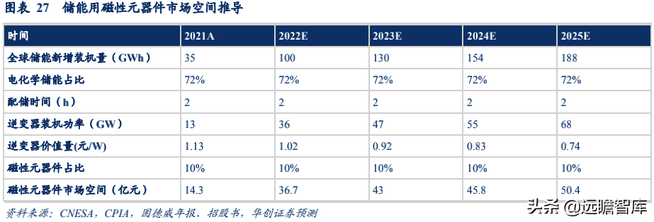 储能逆变器市场空间推导: 全球储能新增装机量根据 CNESA、CPIA 数据整理,其中电化学储能占比根据 2020 数据取 72%;按配储时间 2h 计算逆变器装机功率;根据固德威披露数据,2019 年储能逆变器价值量在 1.2~1.6 元/W,取 2019 年 1.4 元/W,按照每年10%降本进行计算。我们计算得 2021 年储能逆变器用磁性元器件市场空间 14.3 亿元,2025 年市场空间 50.4 亿元,4 年 CAGR 37%(2022 年《“十四五”可再生能源发展规划》等政策不断刺激储能市场发展,预计 22 年储能逆变装机规模 36GW,同比增速 177%,高于 4 年复合增速)。我们预测光伏&储能逆变器磁性元器件合计市场空间 2021 年 53.3亿元, 2025 年 113.4 亿元,4 年 CAGR 20.8%。
