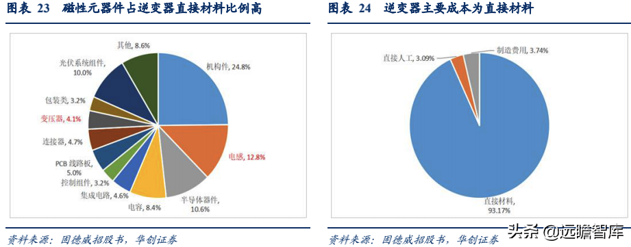磁性元器件占逆变器成本可达 15%,储能逆变器磁性元器件用量更大。 逆变器用磁性元器件包括电感、变压器等,根据固德威数据,2019 年逆变器直接材料成本中电感、变压器分别占比 12.8%和 4.1%,合计占比 16.9%,仅次于机构件的 24.8%,大于半导体器件10.6%的占比;直接材料占逆变器成本比例 93.17%,由此计算电感和变压器占逆变器总成本 15.7%。储能逆变器增加了 AC/DC 等模块,磁性元器件用量更大。
