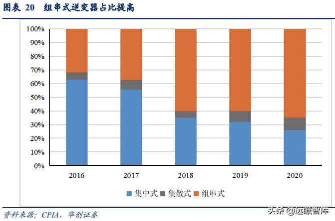 分布式光伏崛起,组串式逆变器占比提高。 分布式光伏崛起叠加组串式在集中电站的渗透,组串式逆变器占比不断提高,2020 年国内组串式逆变器占比接近 65%。