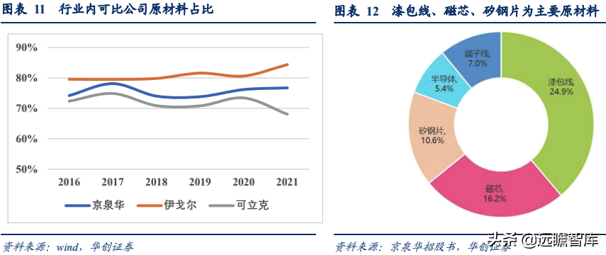 漆包线、磁芯、矽钢片、半导体等为主要原材料 。行业内公司直接材料占比通常在 70%以上,主要原材料为漆包线、磁芯、矽钢片、半导体等。以京泉华为例,漆包线、磁芯、矽钢片、半导体分别占 2016 年采购金额 24.9%、16.2%、10.6%、5.4%。漆包线主要材料为铜材,矽钢片以冷轧硅钢为主要原材料。