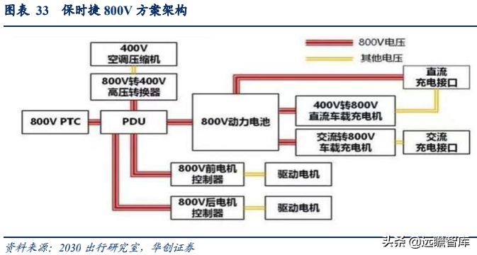 800V 架构下磁性元器件价值量提升,车载磁性元器件国产替代有望加速。 续航里程不足与充电速度慢是新能源车两大短板。提高充电功率主要有大电流低压方案和高压低电流快充方案,大电流方案对散热和线束要求较高,目前主要为特斯拉采用;高压快充方案可有效提升充电效率、提高整车运行效率,保时捷于 2019 年率先推出 800V 电压平台Taycan 系列,Taycan Turbo S 车型的充电功率最高能达到 350KW,22.5 分钟就可以将容量 93.4kWh 的电池从 5%充至 80%。基于 800V 架构的快充方案对车载、充电桩磁性元器件都提出了更高要求,价值量有望提升。过去车载磁性元器件主要被日系厂家把控,800V 方案需对车载元器件性能进行重新审核,国产替代迎来窗口期。