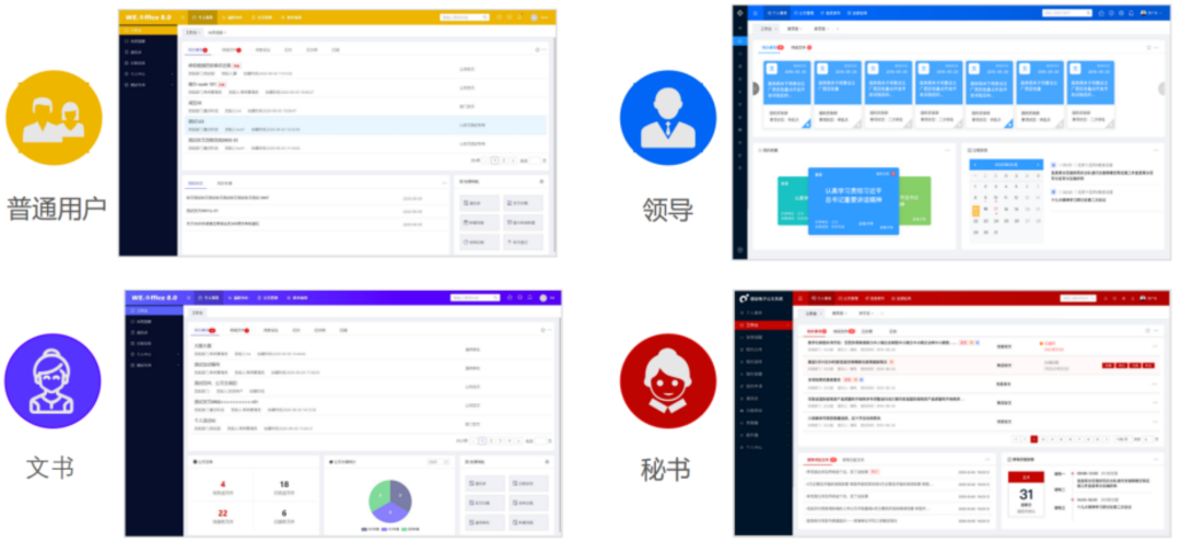 ● 根据不同角色人员工作的重点,内置了多种角色的工作台,包括普通用户工作台、文书工作台、领导工作台、秘书工作台,便于不同角色的用户快速处理事项。