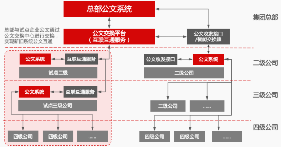 ● 基于公文交换平台,实现推广过程中新旧公文系统互通。支持背靠背发文,跨组织跟踪发文接收情况,及时进行撤回、补发。
