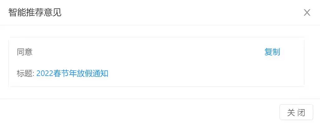 通过当前文件特征要素,与系统中已办文件进行对比分析,形成按相关度排序文件意见列表,辅助当前处理人决策,供当前处理人一键复用。