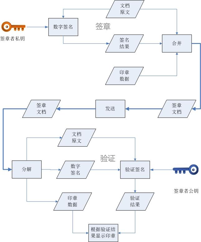 我们看到的印章图像,只是电子印章的外观。它真正核心的数据是对签章者对文档的数字签名 ,因此电子印章对文档的保护就体现在数据的完整性和不可否认性。其工作流程如下:签章时签章者使用其私钥对文档进行数字签名,并将签名结果、印章数据和原文合并成签章文档;验证文档时将数字签名、印章数据从签章文档中分离出来,针对文档和数字签名进行验证,并根据验证结果显示印章。对比数字签名过程,两者基本是一致的。