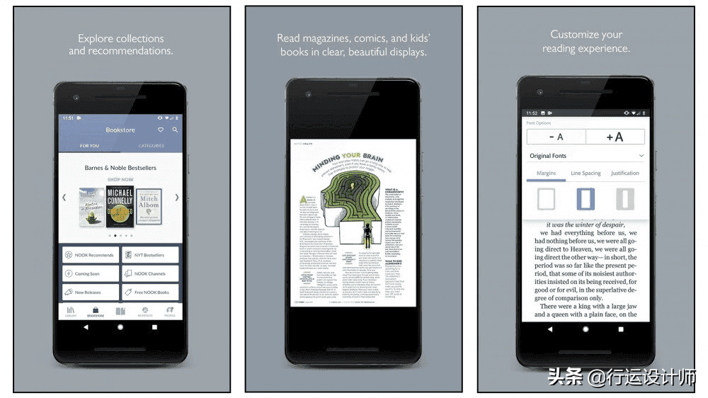 应用程序底部的导航栏使您可以在应用程序的不同部分之间进行切换。在这里,您会看到自己的图书馆,书店,个人资料,读出的内容以及用于跳入当前正在阅读的杂志或书籍的选项。该商店设计时尚,所有商品均按类别进行分类,不过如果您确切地知道自己要寻找的商品并且不想花任何时间浏览,也可以使用搜索按钮。NOOK具有内置的词典,可轻松自定义字体大小,边距,亮度,页面动画甚至背景颜色等内容。NOOK非常易于使用,不会因花哨的额外功能或布局困难而困扰您。