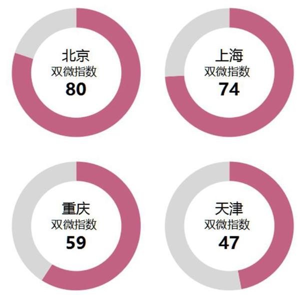 “双微”指数是用来比较衡量政府官方微信、微博活跃度和服务提供效能的重要指标。从整体来看,四直辖市微博和微信的服务能力情况呈现一定的正相关性,但微博的情况整体好于微信。比较而言,北京和上海市“双微”服务能力指数较高,天津市在“双微”渠道的应用上落后于其他三市。