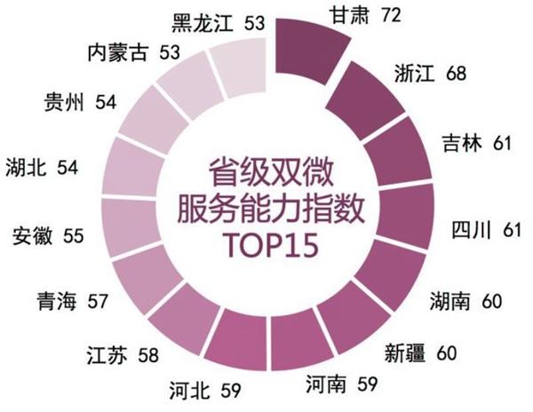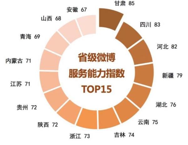据报告,甘肃省、浙江省、吉林省的省级政府“双微”服务能力指数分居全国的第一、第二和第三位。省级政府“双微”服务能力指数平均值为50.15,18个省级政府的“双微”服务能力指数均超过全国平均值,占比为66.7%。甘肃省政务微博和政务微信平台创办较早,信息发布形式多样,具有文字、图片、音频、视频等多种信息载体,信息发布量大、时效性强、权威度高、影响力显著,活跃度较高,交互体验良好等特点。