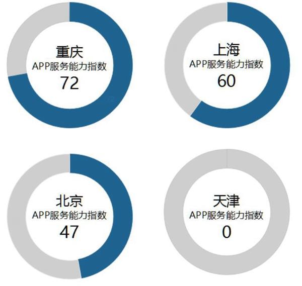 四个直辖市中,重庆市的政务APP服务能力超越北京、上海位列第一,该市的政务APP不仅功能全面、信息完备,而且符合用户的使用习惯。上海市和北京市分列二、三位,其提供信息的丰富度和APP使用体验的反馈机制稍显逊色,截至测评时天津市尚未开通政务APP服务渠道。