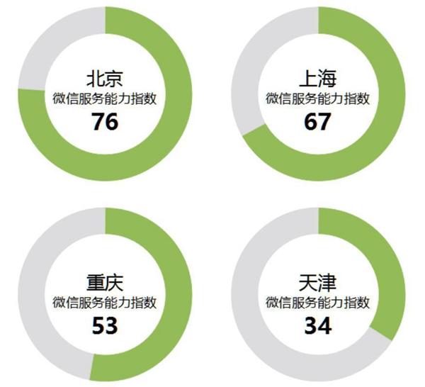 四个直辖市中,北京市位列第一,该市政务微信不仅能及时发布市民所需的信息,同时较好实现了事务的在线办理。上海市排名第二,该市政务微信在参与服务能力和微信影响力上稍逊一筹。目前,各直辖市的政务微信主要以信息发布为主,在事务服务、参与服务等环节上还有很大的发展空间。