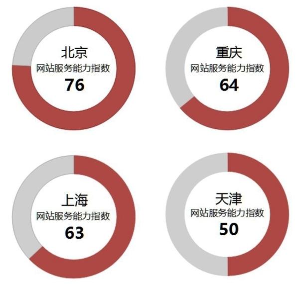 在四个直辖市中,北京市门户网站的服务能力位列第一,在信息发布和网上办事能力上成效显著,网站便捷易用,且稳定可靠。重庆市和上海市分列二、三位,针对用户反馈的回应和处理效率值得肯定。