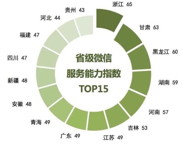 报告显示,浙江省政务微信位列第一,甘肃省、黑龙江、湖南省、河南省分列2-5名。发展新媒体渠道、重视服务创新,是助力智慧城市发展的重点,浙江省在此方面表现尤为突出,截止 2015年8月底,浙江省45.3%的省级部门开通了政务民生微信公众号,所有地级市都上线了微信城市服务功能。其政务民生微信公众号无论是用户规模还是用户活跃度都处于全国领先地位。然而仍有部分省份尚未开通政务微信,部分已开通的政务微信的也因其内容更新不及时、服务内容单一而难以发挥微信平台的服务潜能。