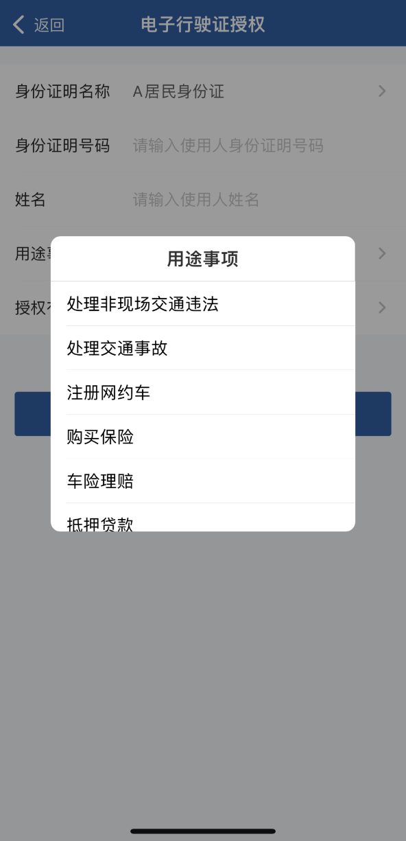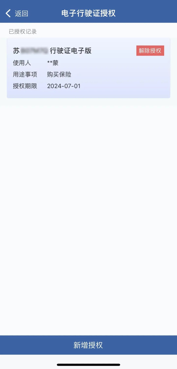 点击电子行驶证下方【授权】按钮进入授权列表,点击页面下方【新增授权】,填写被授权人身份证号、姓名和授权有效期,选择用途事项,提交授权。提交后被授权人电子证件列表中将增加授权电子行驶证列表项,用户可点击显示授权出示的电子行驶证。
