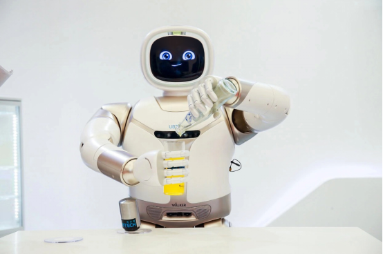 Walker展示了在家庭场景中的服务能力,作为一名“智能助手”,Walker可以为人类开冰箱、取水果、倒水、播放音乐、跳舞等。其由优必选科技全自主研发,是一款形象亲和、交互自然、适应家庭场景的大型仿人服务机器人,搭载了36个高性能伺服关节,以及力觉、视觉、听觉和平衡等全方位的感知系统,拥有复杂地形灵活行走、自平衡能力、手眼协调操作、全身柔性安全交互、U-SLAM导航避障、人脸/物体/场景识别、多模态交互、智能家居控制等功能,具备在常用家庭场景和办公场景的自由活动和服务的能力,是中国第一款可商业化落地的大型仿人形服务机器人。