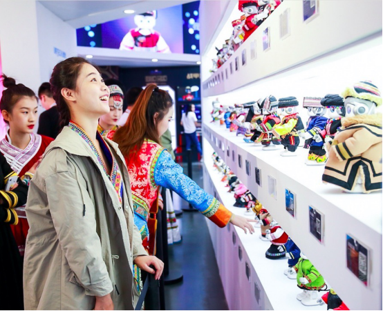 庆祝建国70周年,优必选科技与中央美术学院合作的项目也在现场展出,双方大胆探索“科技X艺术X民族文化”的边界,精心考究各民族的传统服饰特点与民族文化传承印记,为悟空机器人量身定做了56套民族服饰,悟空机器人用语音故事、主题海报、互动游戏等多样的形式演绎中华民族创新故事。由2018《中国新说唱》的冠军艾热创作的歌曲《悟空说》也在现场同步亮相,56个身穿民族服饰的悟空机器人凭借超强的生命感与表现⼒,带来壮丽的民族之歌,致敬充满智慧和创新精神的56个民族,用民族科技与文化的创新融合践行“科技兴国”的国家战略。