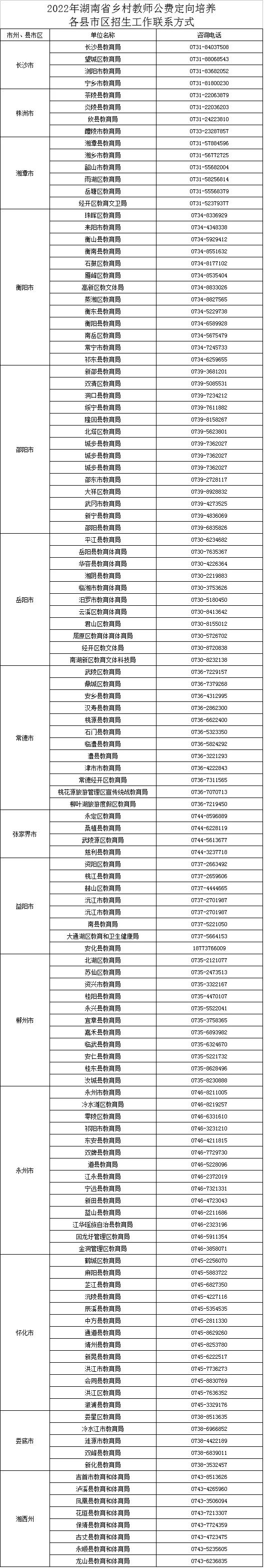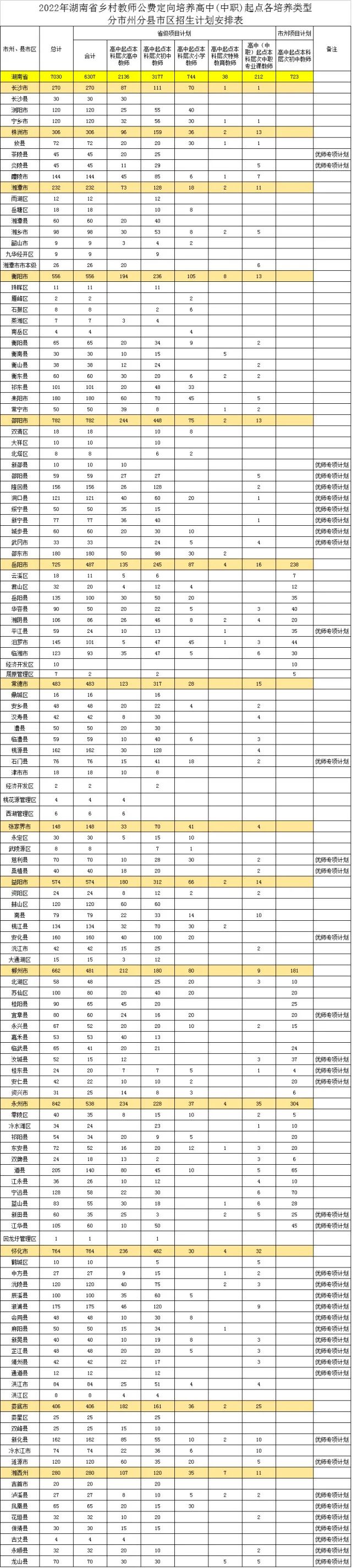 近日,湖南省教育厅发布通知,2022年我省继续实施高中(中职)起点本科层次乡村高中、初中、小学、特殊教育和中职专业课教师公费定向培养计划。该计划按照“自愿报名、择优录取、公费培养、定向定期服务”的原则,通过普通高考和普通高校对口招生考试进行招生。一、招生学校与专业 (一)本科层次高中教师公费定向培养。招生学校为:湖南师范大学、湖南农业大学、湖南科技大学、湖南工业大学、湖南理工学院、衡阳师范学院。招生专业为:汉语言文学、数学与应用数学、英语、物理学、化学、生物科学、思想政治教育、历史学、地理科学、音乐学、美术学、体育教育、计算机科学与技术、教育技术学、心理学、应用心理学。(二)本科层次初中教师公费定向培养。招生学校为:衡阳师范学院、湖南理工学院、怀化学院、邵阳学院、湘南学院、湖南人文科技学院、湖南科技学院、湖南第一师范学院、长沙师范学院、湖南文理学院。招生专业为:汉语言文学、数学与应用数学、英语、物理学、化学、生物科学、生物技术、思想政治教育、历史学、地理科学、音乐学、美术学、体育教育、计算机科学与技术、应用心理学。(三)本科层次小学教师公费定向培养。招生学校为:湖南第一师范学院、长沙师范学院、湖南文理学院、湖南城市学院。招生专业为:汉语言文学、英语、小学教育、音乐学、体育教育、美术学。(四)本科层次特殊教育教师公费定向培养。招生学校为:湖南师范大学。招生专业为:特殊教育。(五)本科层次中职专业课教师公费定向培养。招生学校为:湖南师范大学、湖南农业大学、湖南科技大学、衡阳师范学院。招生专业为:机械工艺技术、应用电子技术教育(电子技术应用方向)、应用电子技术教育(电子电器应用与维修方向)、视觉传达设计、车辆工程、农学、材料成型及控制工程、机械设计制造及其自动化、旅游管理、财务管理。二、招生计划 2022年,我省高中(中职)起点本科层次各类乡村教师公费定向培养招生计划为7030人。其中,结合教师厅〔2021〕3号文件要求,我省40个脱贫县(原集中连片特困县、国家扶贫开发工作重点县)的相应招生计划同时列入教育部中西部欠发达地区优秀教师定向培养专项计划地方优师专项(以下简称省级优师专项),具体如下:(一)本科层次高中教师公费定向培养招生计划:2136人,类型为普通高考招生计划。其中,省级优师专项865人。(二)本科层次初中教师公费定向培养招生计划:3900人,类型为普通高考招生计划。其中,省级优师专项1444人。(三)本科层次小学教师公费定向培养招生计划:744人,类型为普通高考招生计划。其中,省级优师专项221人。(四)本科层次特殊教育教师公费定向培养招生计划:38人,类型为普通高考招生计划。其中,省级优师专项16人。(五)本科层次中职专业课教师公费定向培养招生计划:212人,类型分为普通高考招生计划和对口招生计划。其中,省级优师专项82人。根据我厅《关于申报2022年湖南省乡村教师公费定向培养招生计划的通知》的有关要求,以及各市州向我厅申报的2022年公费定向培养招生需求计划,在综合平衡的基础上,我厅编制了高中起点各类乡村教师公费定向培养招生计划表。招生计划下达后,一律不再追加或调整。三、培养模式 (一)本科层次高中、初中、小学教师均采用四年制本科的培养模式。(二)本科层次特殊教育教师由湖南师范大学和长沙职业技术学院联合培养。本科学制四年,人才培养方案由湖南师范大学和长沙职业技术学院共同制定,原则上第一、二学年由长沙职业技术学院负责培养,第三、四学年由湖南师范大学负责培养。修业期满,成绩合格者,由湖南师范大学颁发本科毕业证书,符合学士学位授予条件的,颁发学士学位证书。(三)本科层次中职专业课教师采用本科院校会同有关高职院校和企业联合培养的模式。本科学制四年,人才培养方案由本科院校与高职院校共同制定,原则上第一、二学年由相关高职院校负责培养,第三、四学年由本科院校负责培养。修业期满,成绩合格者,由本科院校颁发本科毕业证书,符合学士学位授予条件的,颁发学士学位证书。联合培养工作安排见《2022年湖南省高中(中职)起点本科层次乡村中职专业课教师公费定向培养学校安排表》。四、培养经费 根据《湖南省人民政府办公厅关于印发<教育领域省与市县财政事权和支出责任划分改革实施方案>的通知》(湘政办发〔2020〕15号),省级项目计划所需培养经费由省与市县财政按7:3比例分担,市州项目计划所需培养经费由市县财政承担。公费定向师范生在校学习期间的学费、住宿费、教材费和军训服装费免缴,其所需费用由财政公费承担;并按国家和省有关规定享受奖助学金等资助政策,在资助政策规定的范围内与其他在校生享受同等待遇。五、招生对象及条件 (一)本科层次高中、初中、小学、特殊教育教师1.具有招生计划定向的县市区所在市州范围内户籍(户籍迁入截止时间为2022年6月7日)。2.年龄未满22周岁(2000年9月1日及以后出生)。3.2022年湖南省普通高考成绩达到招生学校相应类别本科录取控制分数线,考生高考选考科目符合招生学校选科要求。4.身体健康,体检合格。体检工作要求按湖南省教育考试院《关于做好2022年全省普通高等学校招生体检工作的通知》(湘教考普字〔2021